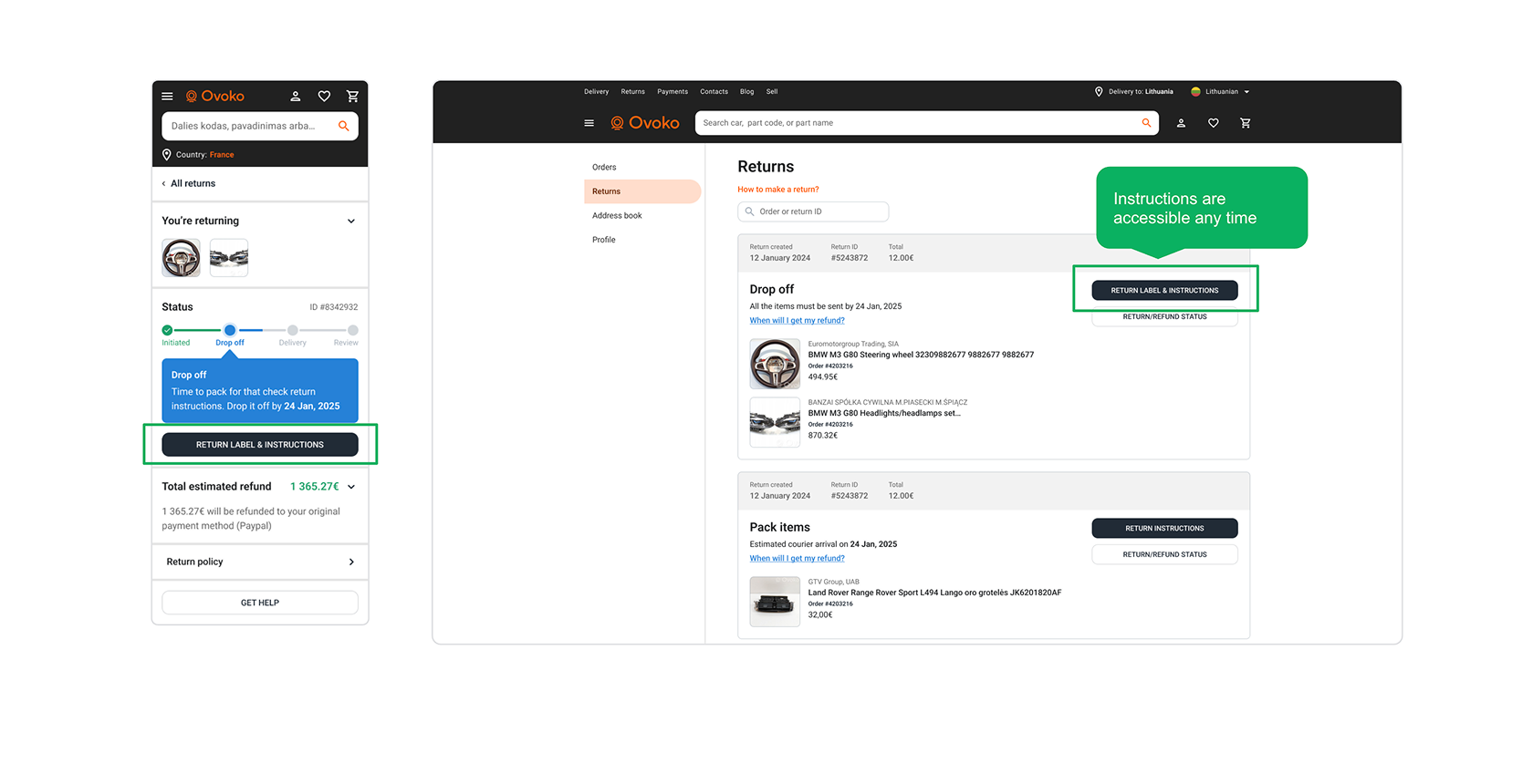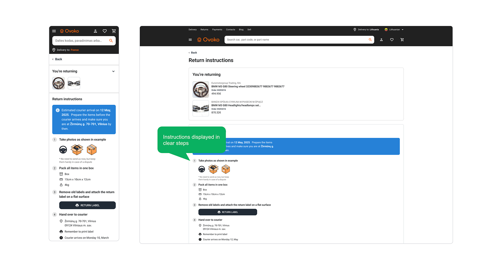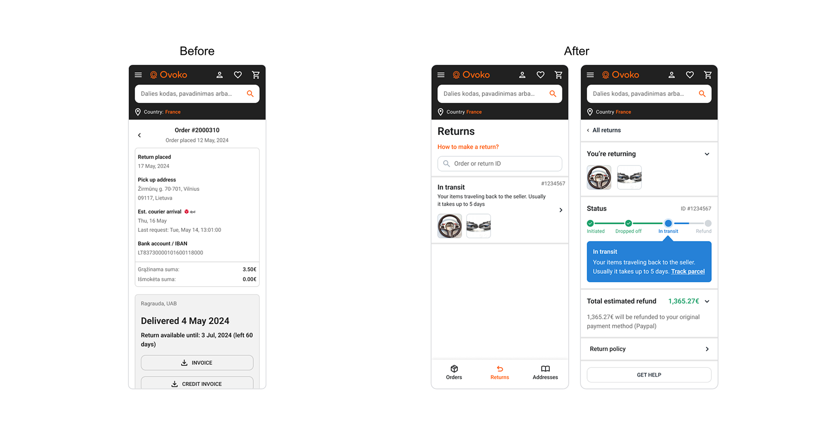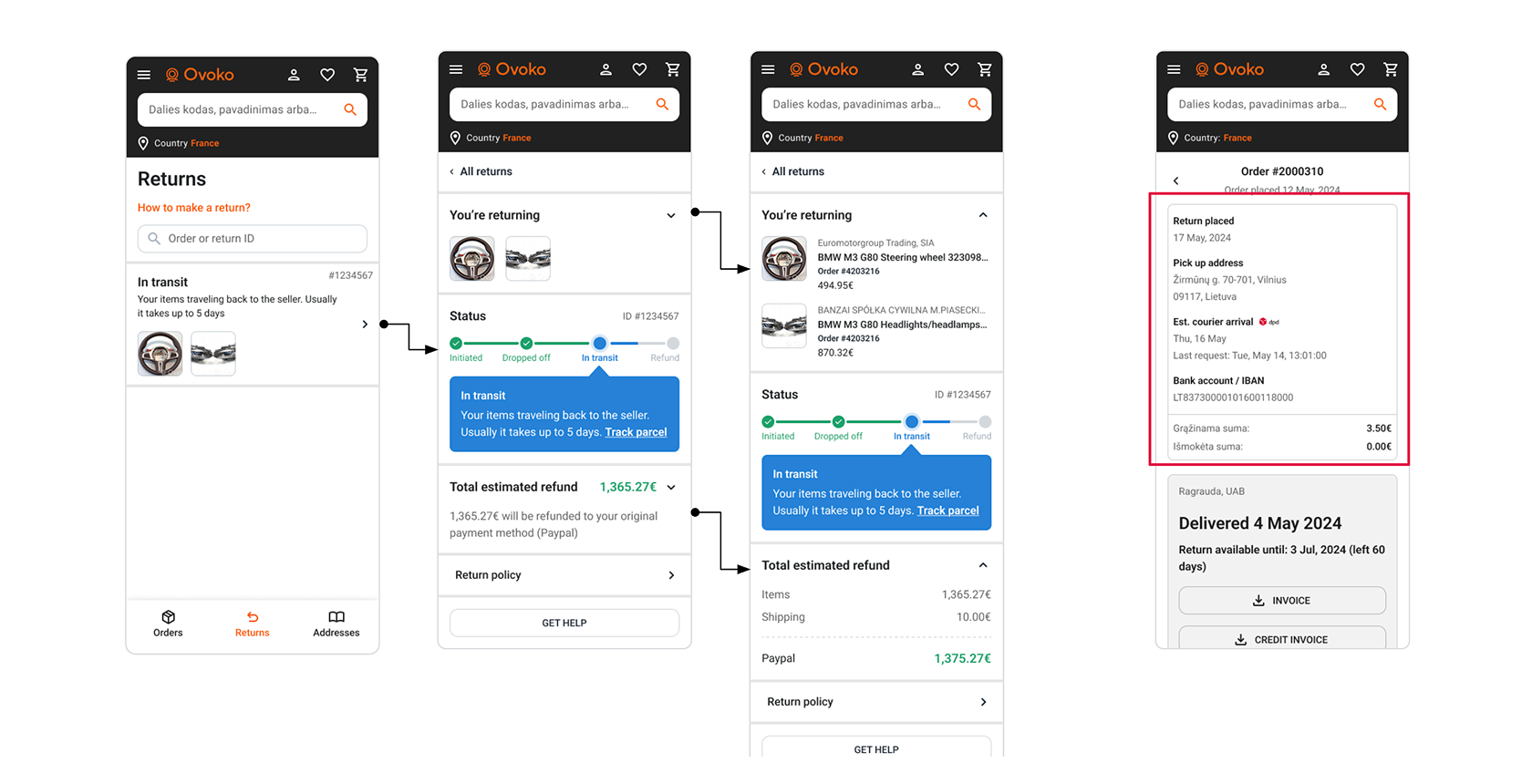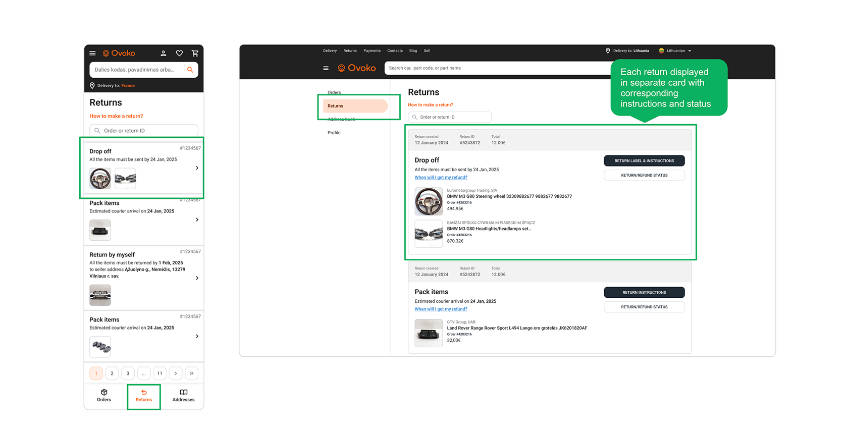 Both orders and returns are quite complex in their logic. Multiple sellers, different shipping options, some parts are tiny, bulky ones go on a pallet. When sellers receive an item from a buyer, each has to review it in our SaaS. So yeah, you get it, it’s complicated.That’s why a separate ’Returns’ section made a lot of sense.