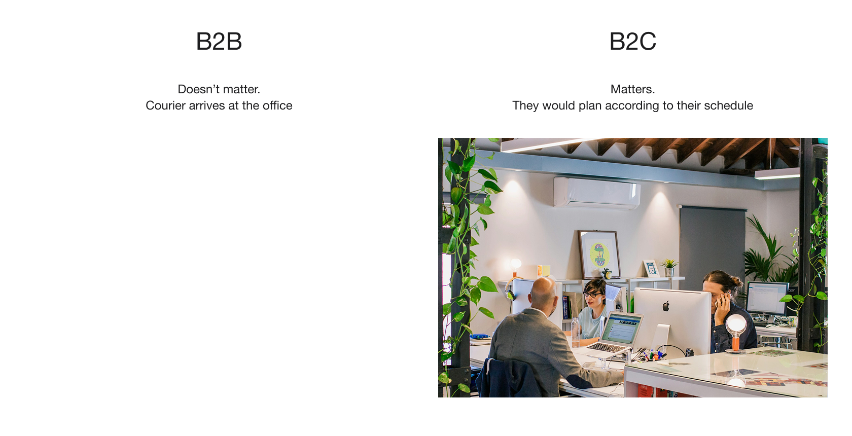 A key difference is parcel handover. B2B users work from bodyshops and manage deliveries and returns at the workplace. B2C users receive items at home and must return them via courier pick-up. Since they’re often not home, they prefer choosing a specific day for the courier visit.