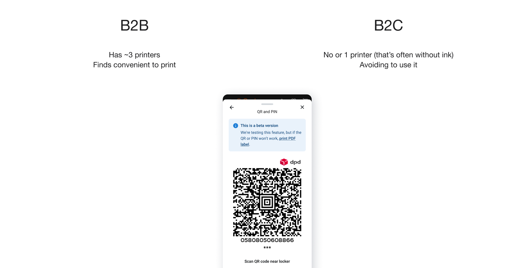 Another difference we discovered between these two groups was access to printers. You might wonder why this matters. Well, it has a direct impact on the overall user experience. Three out of five of our marketplace users don’t have a working printer at home, either because they don’t own one, or it’s out of ink or simply not functional. Our return process required users to print a shipping label, which added extra steps: finding a printing service, scheduling time, and even paying for paper. Not exactly convenient, right? That’s why we used our Autonomy Days to explore a better solution.