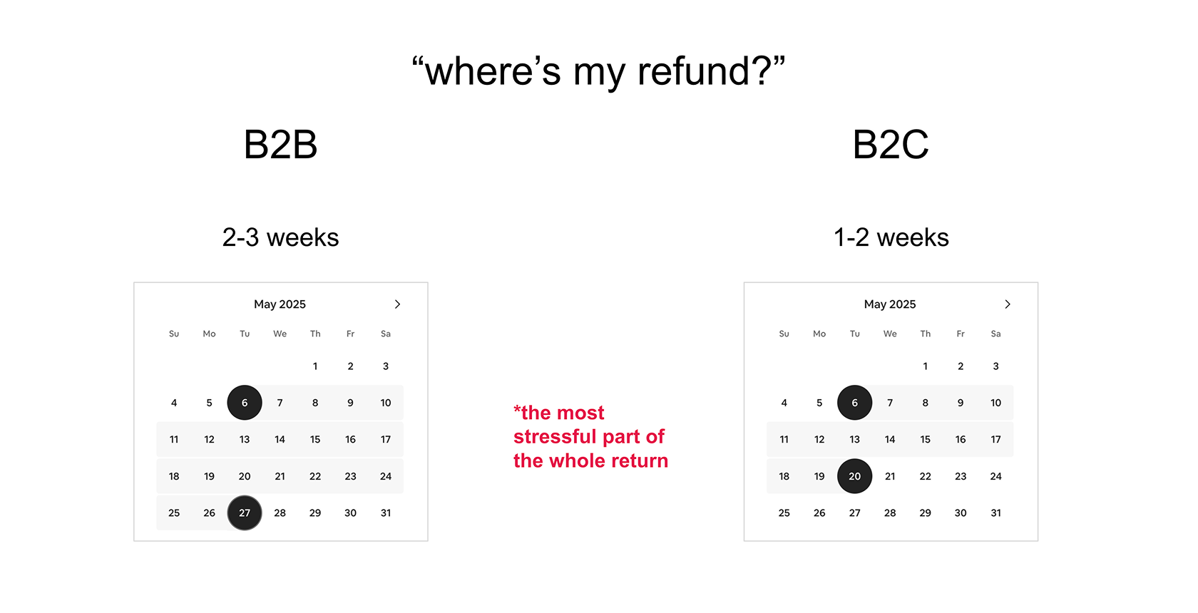 The starting point for that concern is either when the parcel is picked up by the courier or dropped off at a PUDO location. As you can see, businesses are more patient, they usually wait 2–3 weeks before following up, and they’re familiar with our business logic that requires the seller to confirm the return. Regular users, on the other hand, tend to expect a refund within 1–2 weeks.