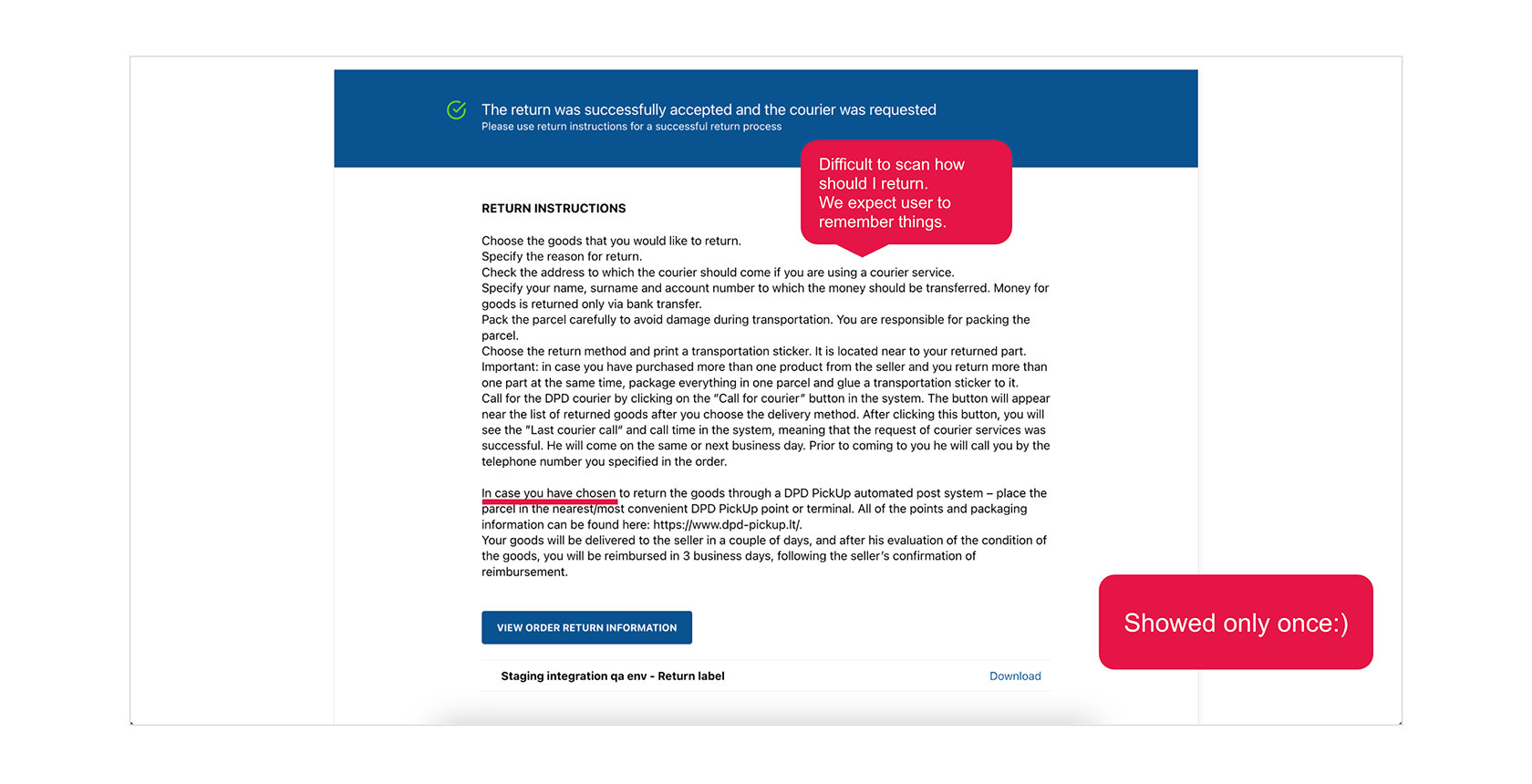 The funniest part of the legacy return flow for me was the instructions screen. You’d fill out your return form, get a success page with the instructions, and then if close window, bye-bye, you’d never see them again:D Don’t ask me why, but now users will be able to access their instructions anytime, right there in the UI and via email too.